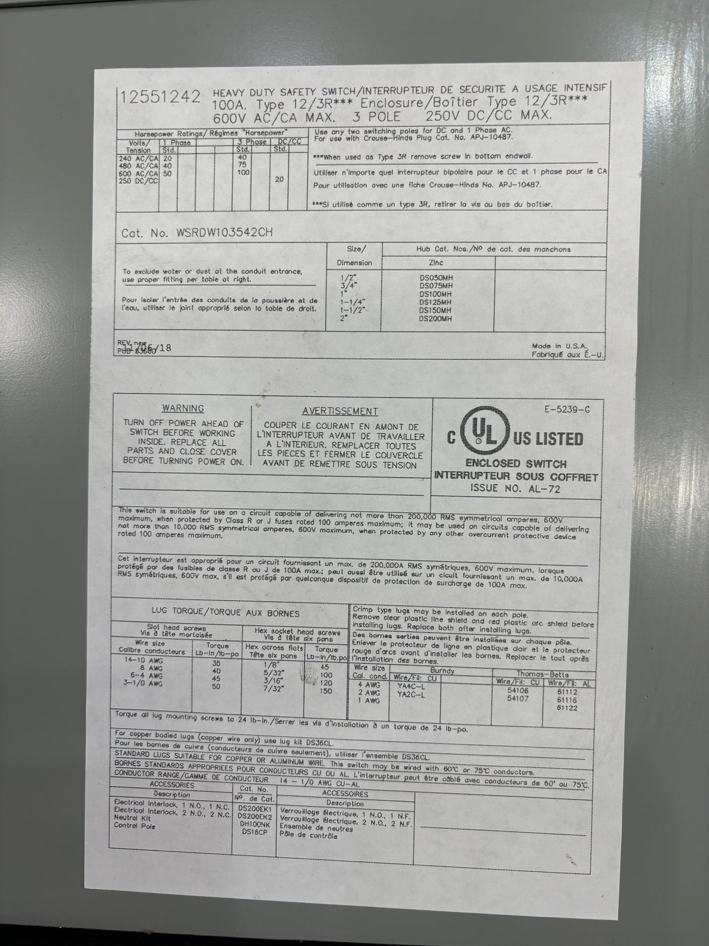 WSRDW103542CH 100AMP EATON CROUSE HINDES FUSIBLE SWITCH